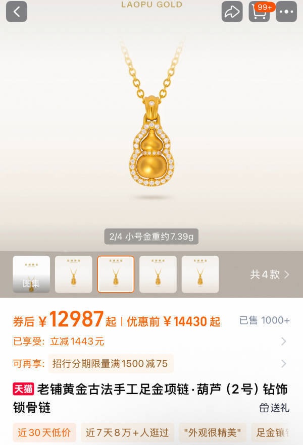 双11期间,老铺黄金天猫旗舰店推出“每满1000元减100元”活动,满10万元赠专属首饰盒。观察者网注意到,原价14,430元的葫芦(2号)钻饰锁骨链优惠后为12,987元,优惠近1500元,与品牌新店特惠的折扣幅度相持平。